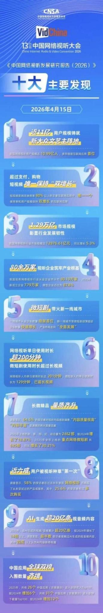 2026年4月15日,第十三届中国网络视听大会在四川成都开幕,中国网络视听协会现场发布《中国网络视听发展研究报告(2026)》核心成果。报告全面呈现我国网络视听行业发展最新格局:行业用户规模逼近11亿,持续位居互联网应用首位;市场规模突破1.28万亿元,产业韧性显著增强。行业在用户增长、内容供给、技术创新、消费带动与全球化布局等方面亮点突出,已成为我国数字大众文艺主阵地与数字经济重要支撑。