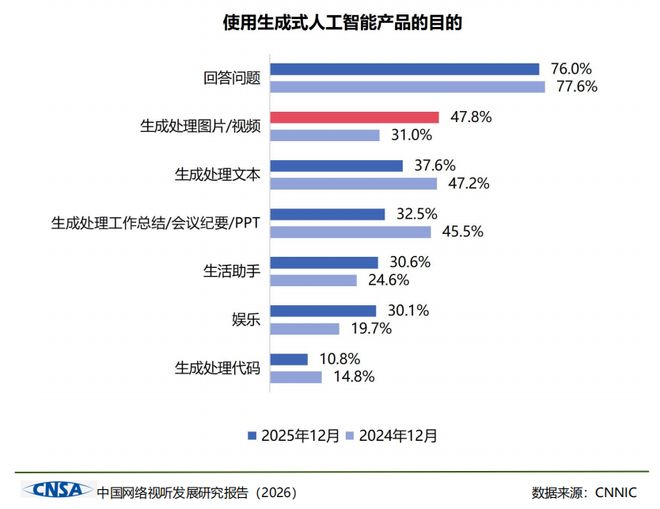 报告显示,截至2025年12月,在网民使用率80%以上的主要网络应用中,网络支付、网络购物、即时通信等应用的用户规模或使用率均有下降,短视频是唯一一个用户规模和使用率“双增长”的细分应用。