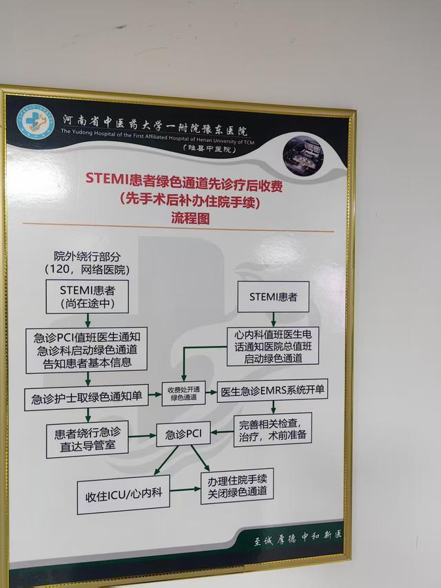 事发时,田女士拍下的照片显示,睢县中医院大楼上标有胸痛中心,院内挂有STEMI(注:ST段抬高型心肌梗死简称)患者急诊PCI的流程。