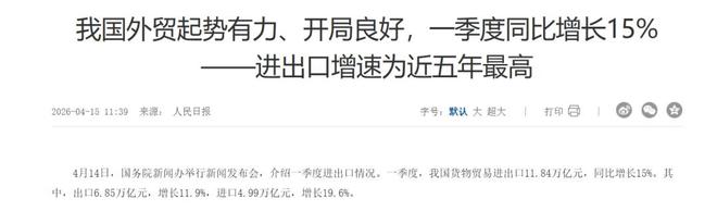 《节点财经》注意到,这个判断并非空穴来风。今年一季度,中国外贸创下11.5万亿的历史新高,同比增长15%。