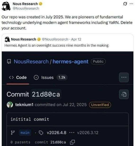这篇长文发出后迅速在程序员圈和开源社区引发热议。而Hermes Agent的开发团队,硅谷知名AI实验室Nous Research的官方账号也很快做出了相当强势的回应,称“我们的仓库2025年7月就有了。我们是‘先驱’。删除你们的账号。” 不过不久之后,这条回应又被删除了。
