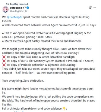 不过Hermes Agent还没火上太久,就爆出了抄袭的丑闻。4月15日,中国AI团队EvoMap在X上发表长文,指控Hermes Agent抄袭了该团队开源的智能体自进化引擎Evolver,并在结尾给出了一份技术对比报告的链接。