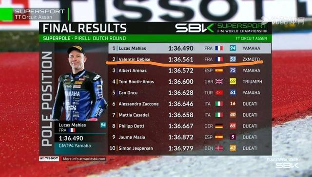 张雪机车53号车手瓦伦丁·德比斯跑出1分36秒561的单圈最快成绩,拿下荷兰站SSP组别超级杆位排位赛亚军。