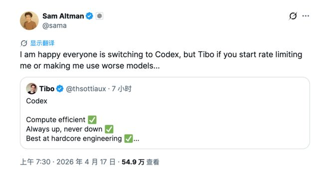 Sam Altman 似乎也终于从袭击的阴影中走出,还有空在社交媒体上调侃 Codex 负责人 Thibault Sottiaux,“我很高兴大家都在转向 Codex,但是 Tibo,如果你开始限制我的速率或者让我使用更差的模型……”