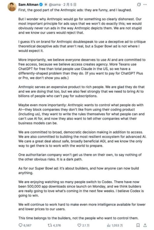 Sam Altman 不打自招,愤而在 X 上更新一条数百字的推文,强调“我们显然不会以 Anthropic 描绘的方式投放广告”。他称,用一则带有误导性的广告去批评那些根本不存在、只是假设中的误导性广告,的确很符合 Anthropic 一贯的双重标准。