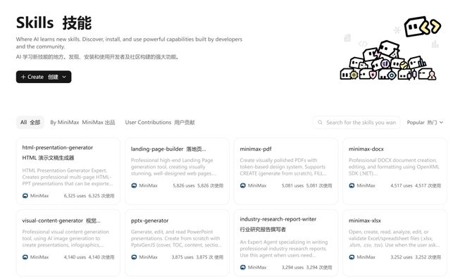 为了方便大家获取和使用,MiniMax还上线了Skillhub,精选上百种Skills供探索安装。最近一次更新他们直接把语音模型和音乐模型也接入了OpenClaw生态,小龙虾能说话、能唱歌。