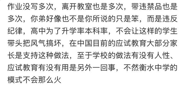 还有网友认为,考核制度名目繁多令人窒息,“天天考虑这么多怎么用心学习”,仅看考核表,苏先生弟弟没有重大过错,劝退处理过于苛刻。网友劝苏先生不要着急,转学或许对弟弟是好事。