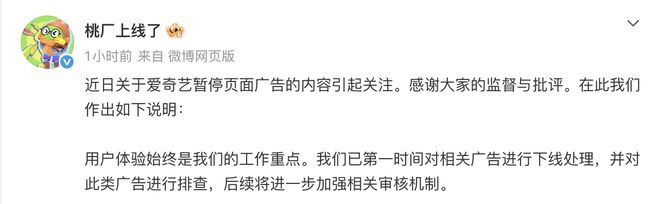 4月23日晚,爱奇艺公司官方发言人账号@桃厂上线了 发文称,已第一时间对相关广告进行下线处理,并对此类广告进行排查,后续将进一步加强相关审核机制。