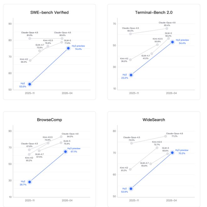 代码与智能体能力方面,Hy3 preview在SWE-Bench Verified(解决现实世界软件问题)、Terminal-Bench 2.0(智能体端到端执行)、BrowseComp(互联网上定位关联信息)基准测试中,得分都低于Claude-Opus-4.6和GLM-5,Terminal-Bench 2.0得分超过Kimi-K2.5。Hy3 preview在WildClawBench(智能体真实落地能力)、Claw Eval(真实世界任务中的智能体能力)测试中的得分超过Kimi-K2.5,低于GLM-5和Claude-Opus-4.6。在针对真实开发场景表现的混元内部测评集中,Hy3 preview得分超过Kimi-K2.5。