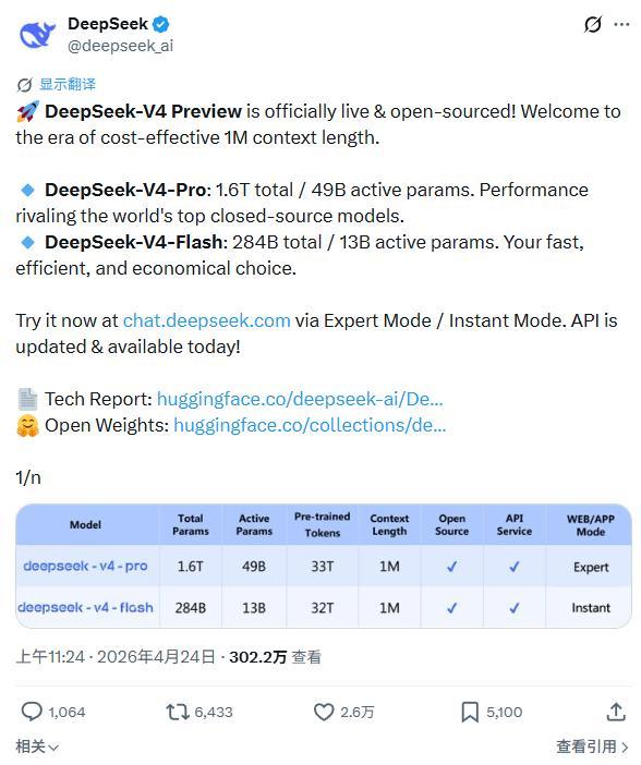 不过,好消息是我们终于不用再等了,DeepSeek V4在4月24日早上10:56正式发布,首发就有Flash和Pro两个版本。这个消息很快就在海外刷屏,DeepSeek V4发布的推文,短时间内就收获了数万点赞和数百万次浏览,评论区也是挤满了人。