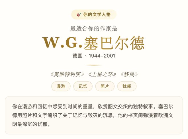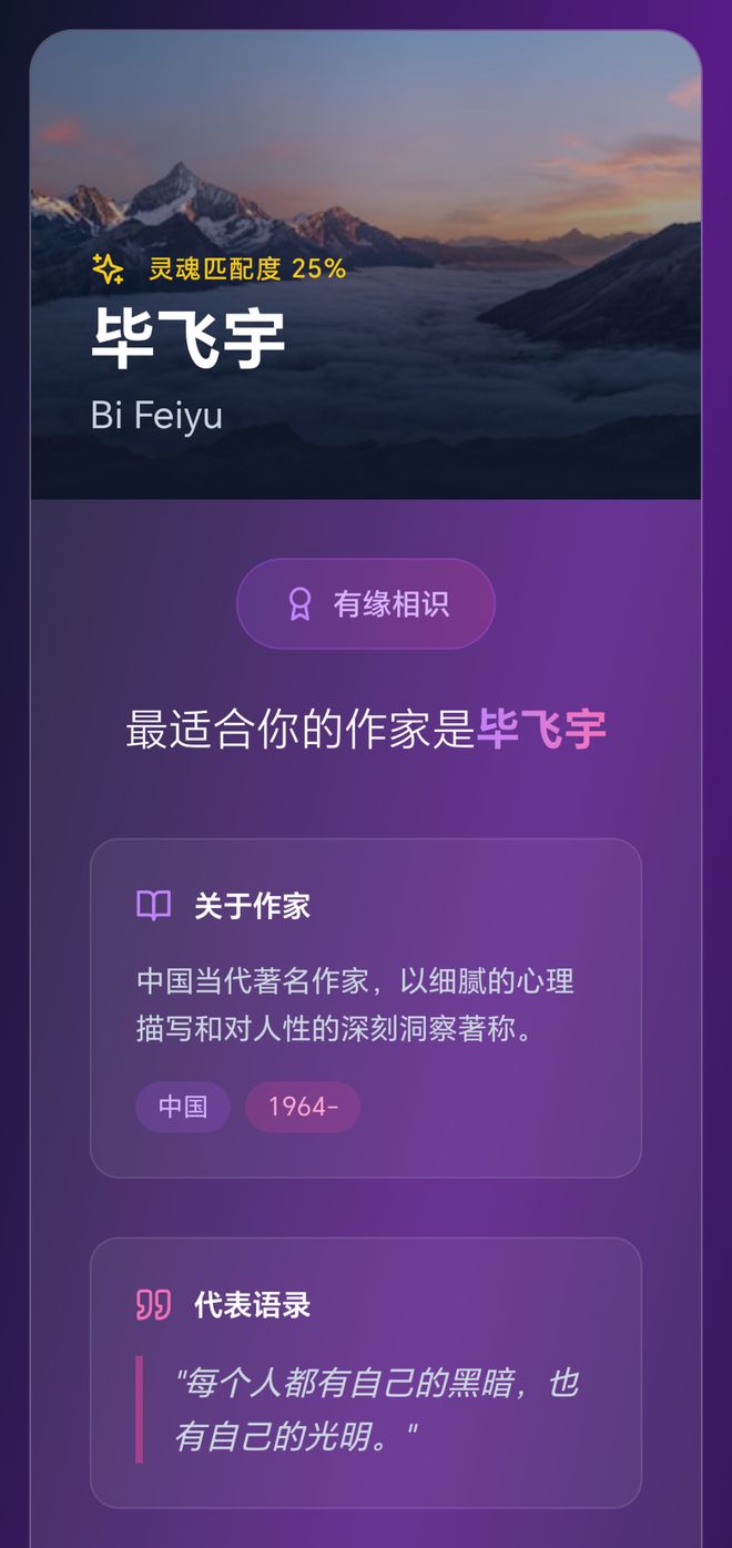 虽然不知道为什么秒悟在配色上唯爱清华紫,而且在出文本选择题的时候像吃了50吨张嘉佳(然而它自己建构的作家库里没有张嘉佳),但作为和朋友自娱自乐的小玩具,可用度还是非常高的。我自己做了测试,竟然真的测出了我喜欢的作家。