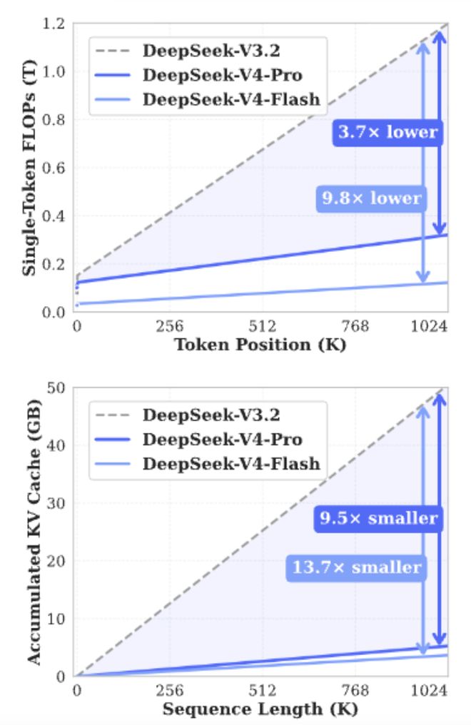 In the one-million-token context setting, DeepSeek-V4-Pro requires only 27% of single-token inference FLOPs and 10% of KV cache compared with DeepSeek-V3.2.