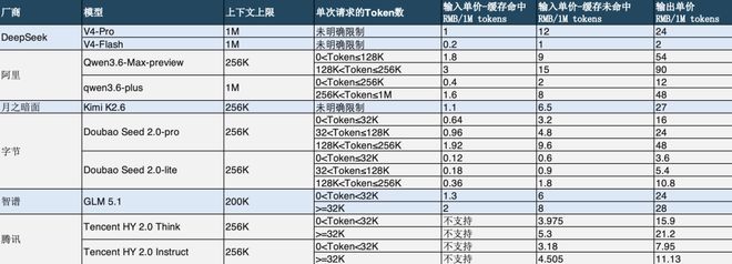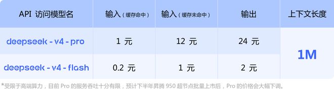 3.按理说,token压缩结合稀疏注意力机制提高计算效率后,厂商的计算成本和显存成本(同等token规模下)都会大幅减少,最终会反映到token定价上。DeepSeek-V4在今天也公布了定价,每百万tokens的定价如下: