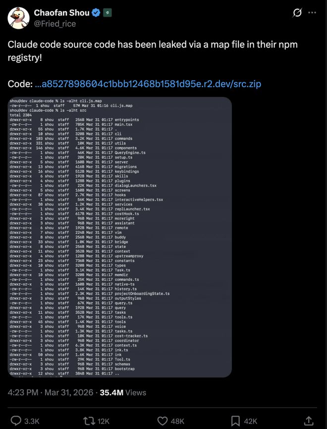 意思就是——51.2 万行未混淆的 TypeScript 源码,1900 个文件,几乎整套内部实现,直接裸奔在公网。