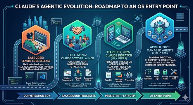 4月8日,Managed Agents公测。沙盒执行、检查点、凭证管理、权限控制、端到端追踪,一整套基础设施补齐。