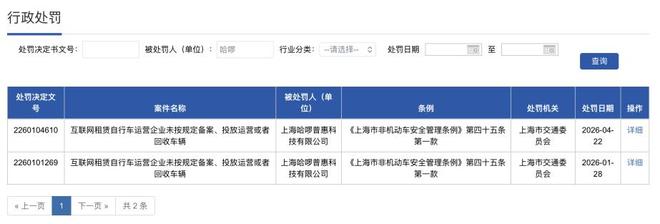 上海市交通委网站显示,此番其实已经是哈啰年内第二次在上海被罚,上一次的处罚时间是今年1月28日,且两次的处罚事由和处罚结果一致。