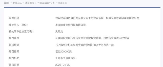 据上海市交通委网站4月24日的公告信息,因“互联网租赁自行车运营企业未按规定备案、投放运营或者回收车辆”,上海哈啰普惠科技有限公司被上海市交通委员会罚款10万元,处罚日期为4月22日。