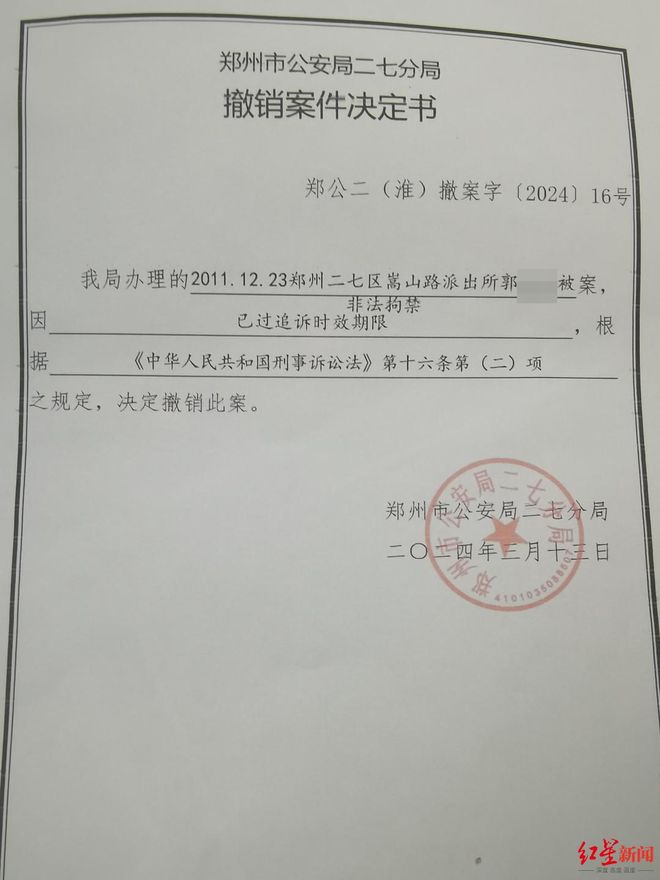 2024年3月13日,郑州市公安局二七分局作出《撤销案件决定书》(郑公二(淮)撤案字〔2024〕16号),以“已过追诉时效期限”为由,依据《中华人民共和国刑事诉讼法》第十六条第(二)项撤销此案。周楷翔则认为,“撤案应该是‘无犯罪事实’或者‘情节显著轻微、危害不大,不认为是犯罪’。