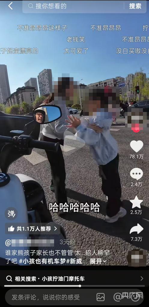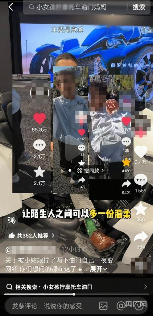 记者观察到,该视频发布者的社交账号认证为沈阳某摩托车销售企业,其账号内发布的多数视频均与摩托车相关。在“小女孩拧油门”的原视频评论区,不少网民留言,希望发布者能寻找小女孩。而在后续的回应视频中,发布者称:“(拧)两下油门能全网刷屏,一亿多人看过,现在全网都让我24小时就搁那路口蹲着,因为大伙还想看那个小女孩拧油门。”