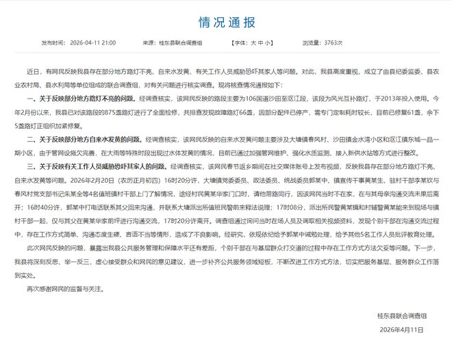 来源:桂东县政府网站 湖南桂东县发布情况通报 情 况 通 报 近日,有网民反映我县存在部分地方路灯不亮、自来水发黄、有关工作人员威胁恐吓其家人等问题。对此,我县高度重视,成立了由县纪委监委、县农业农村... 全文